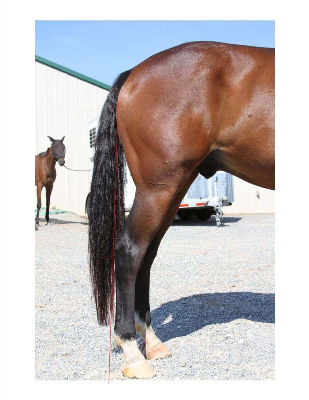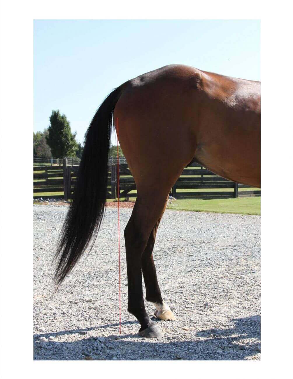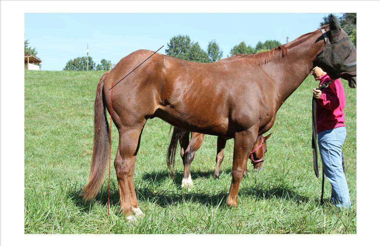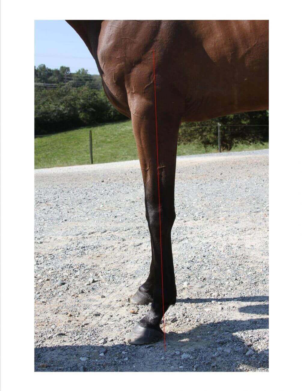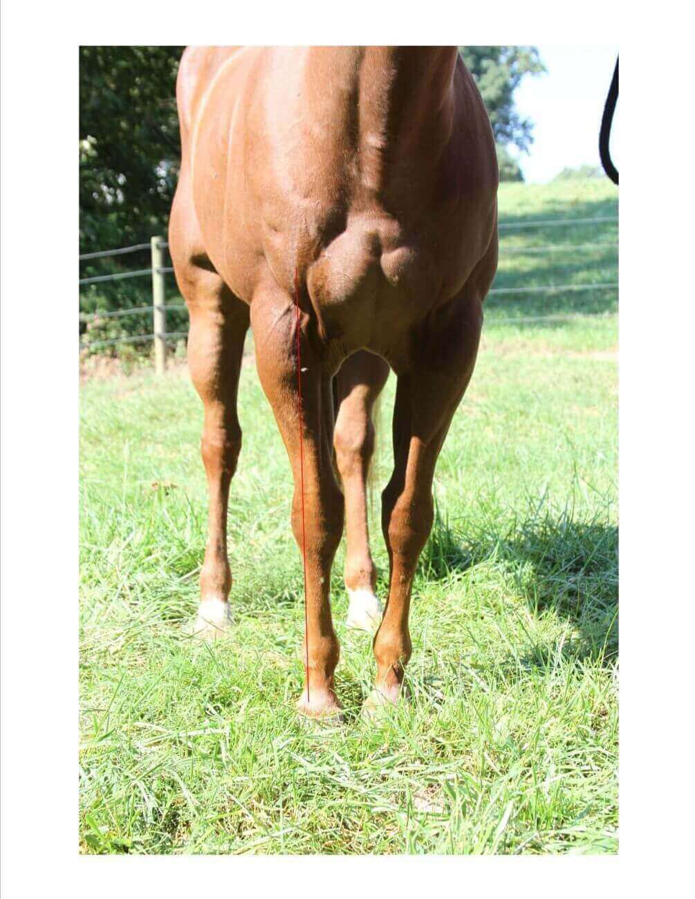 Now let’s look at this guy’s hindlimbs.  As you can see below, if we drop that plumb line down from the point of the ischium to the ground, we do not come into contact with the point of the hock.  Actually the point of the hock is forward from this line, thus we would refer to him as ‘standing under from behind’.  This type of conformation can actually impair forward movement, thrust and power, plus add additional strain to various joints including the hock.