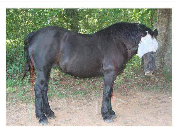 Here we have, for comparison sake, a 12 y.o Percheron mare.  She is very camera shy by nature and thus hopefully the photos will work for our purposes.  In the side view photo, we can see that she is actually standing under from behind and is slightly back in the front limbs as well.  In the head on shot of the front limbs, we see a very broad chest, but actually she is base narrow.
